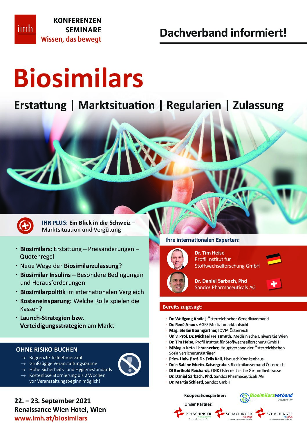 Der Konferenz- und Seminaranbieter imh lädt vom 22. – 23. September 2021 zum „Forum Pharma: Biosimilars“ mit den Themen Erstattung / Marktsituation / Regularien / Zulassung ein. Referenten aus unterschiedlichsten Fachbereichen – darunter auch die Präsidentin des Biosimilarsverbandes Österreich, Dr. Sabine Möritz-Kaisergruber – beleuchten in dieser Fachkonferenz unter anderem neueste Entwicklungen am Biosimilarsmarkt, die Biosimilarspolitik im internationalen Vergleich, die Marktdynamik sowie Themen der Erstattung. Die Veranstaltung findet im Renaissance Wien Hotelstatt.