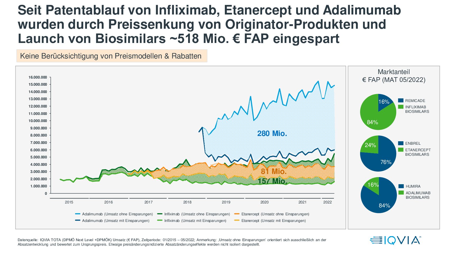 Biosimilars tragen zu deutlichen Einsparungen bei: Seit dem Patentablauf von Infliximab, Etanercept und Adalimumab wurden durch die Preissenkung der Originator-Produkte und dem Launch von Biosimilars ca. € 518 Mio (FAP) eingespart. Diese Einsparungen tragen dazu bei, dass auch weiterhin innovative und teure Behandlungen finanziert werden können.
