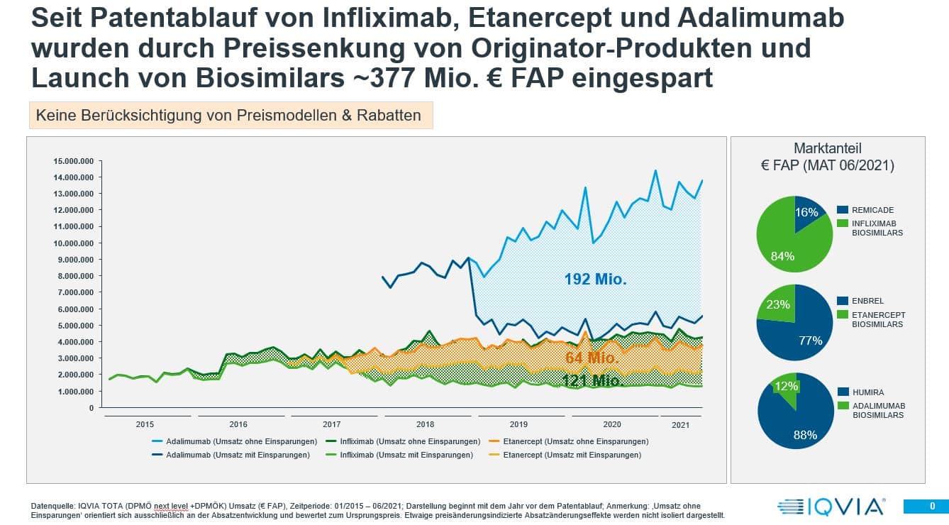 Die Grafik des Monats September zeigt: Seit Patentablauf von Infliximab, Etanercept und Adalimumab wurden durch den Launch von Biosimilars und Preissenkung von Originator-Produkten rund 377 Mio. Euro (FAP) eingespart.