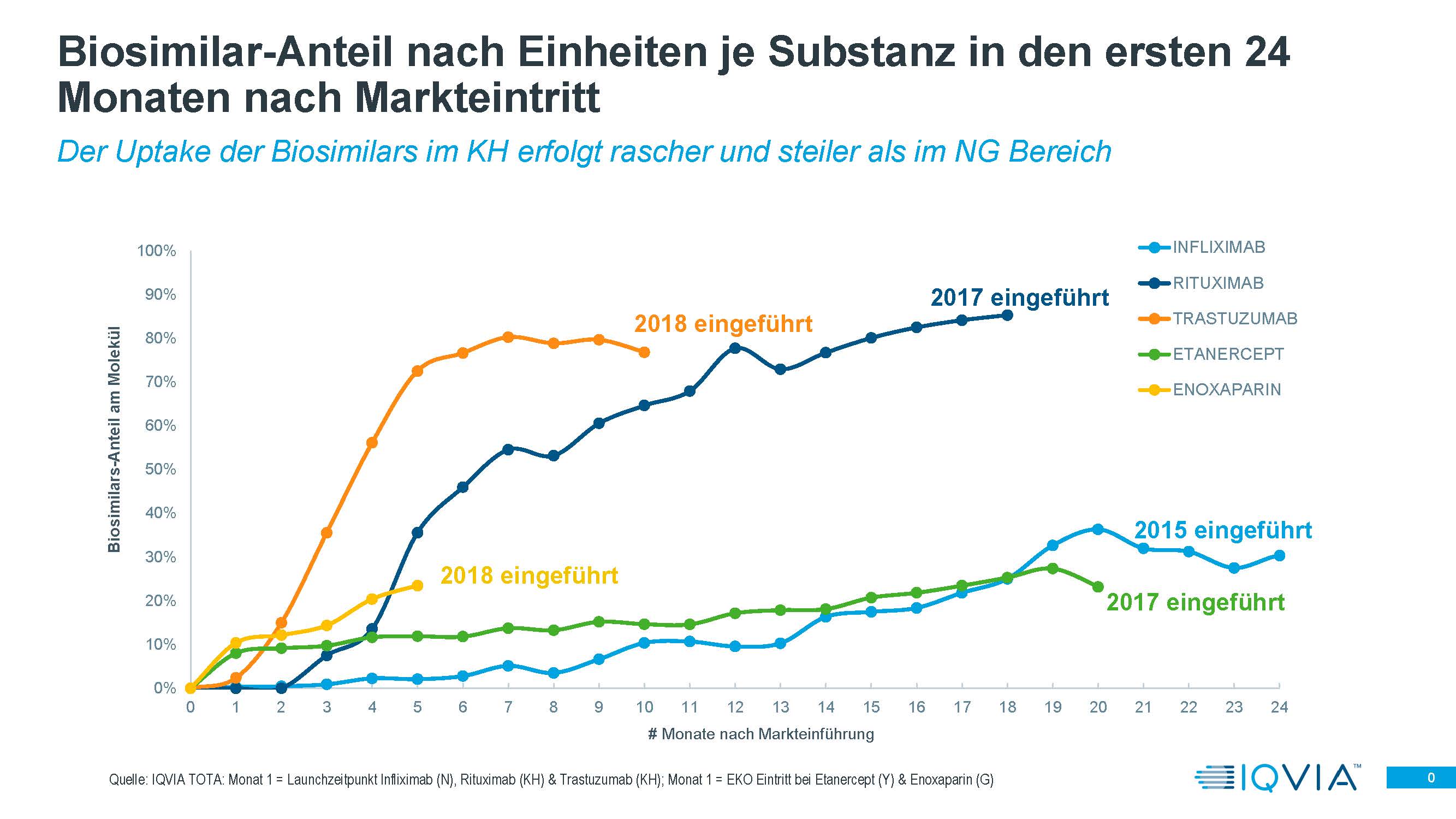 Grafik des Monats Mai: Biosimilar-Anteil nach Einheiten je Substanz in den ersten 24 Monaten nach Markteintritt